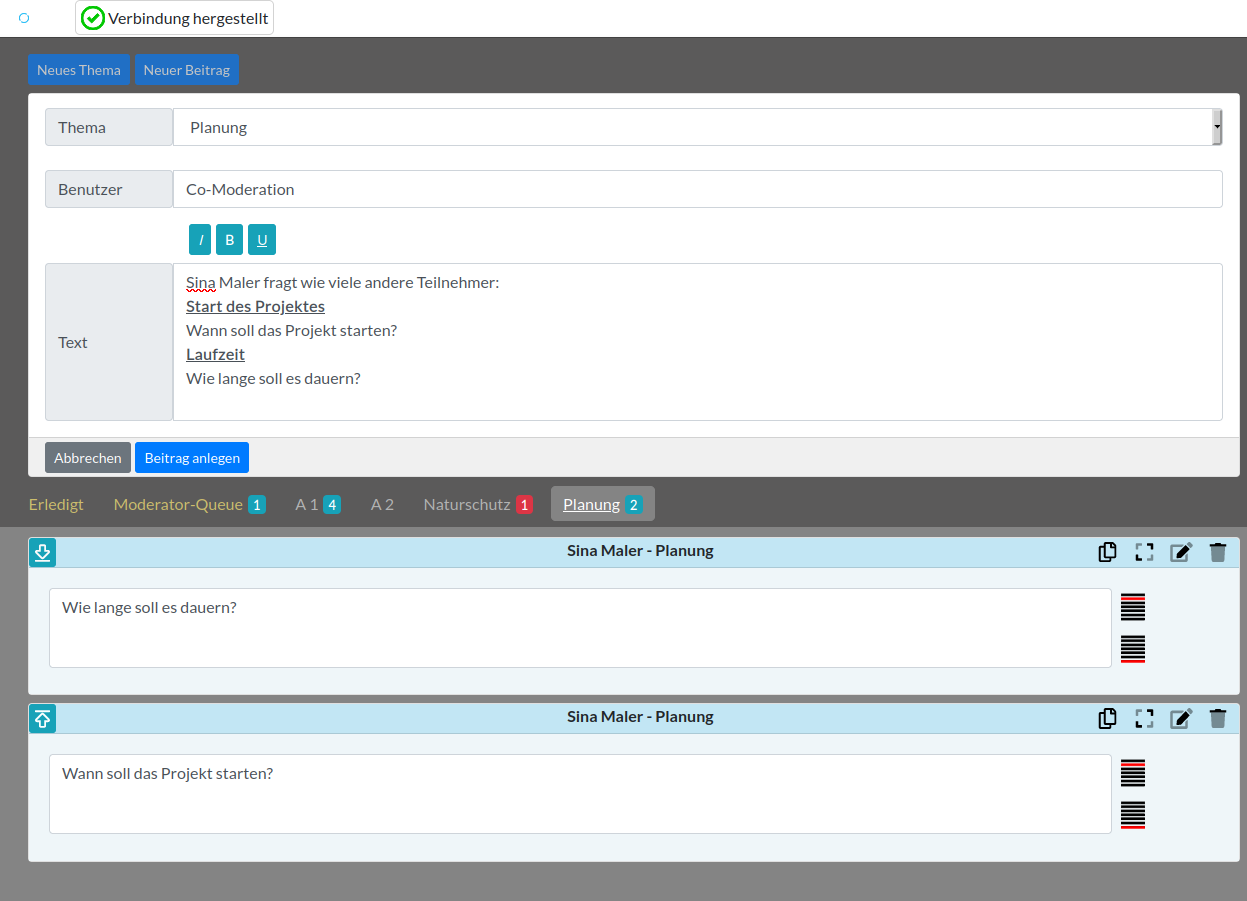 Ihre Moderation bekommt Fragen Ihrer Teilnehmer*Innen in Echtzeit zugespielt. Nach Beantwortung der Frage wird sie erledigt und archiviert.